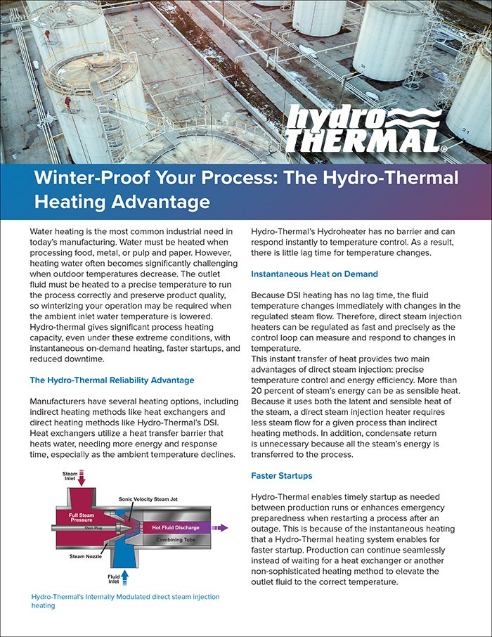 When temperatures drop, industrial water heating becomes a challenge. Maintaining precise outlet temperatures is critical in processing, and Hydro-Thermal’s Direct Steam Injection technology ensures instant, on-demand heating. This allows faster startups and reduces downtime—even in extreme cold. Unlike heat exchangers, DSI system responds instantly to temperature changes, optimizing efficiency and product quality.